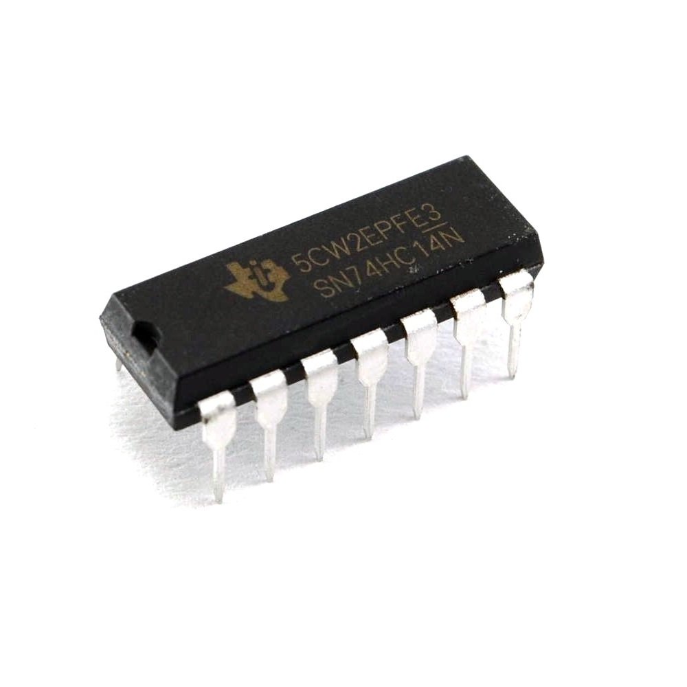 Circuito integrado CMOS 74HC14. Seis inversores Schmitt trigger. El 74HC14 realiza la función booleana Y = A en lógica positiva.