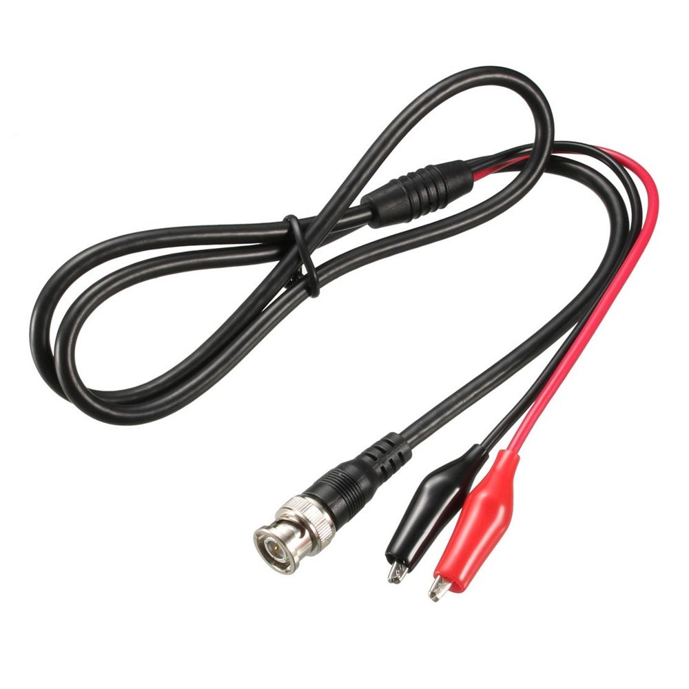 Puntas para osciloscopio con conector macho tipo BNC(que se adapta a la mayoria de los equipos) y caimanes pequeños cubiertos de PvC rojo y negro. El cable es rg58 con una longitud de 92cms